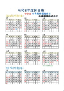 令和8年度休日表のお知らせ 平素より格別のご高配を賜り、厚く御礼申し上げます。 弊社の令和8年度休日表をお知らせ致します。 休業に際しましては、ご不便をお掛け致しますが、 何とぞご容赦下さいます様お願い申し上げます。